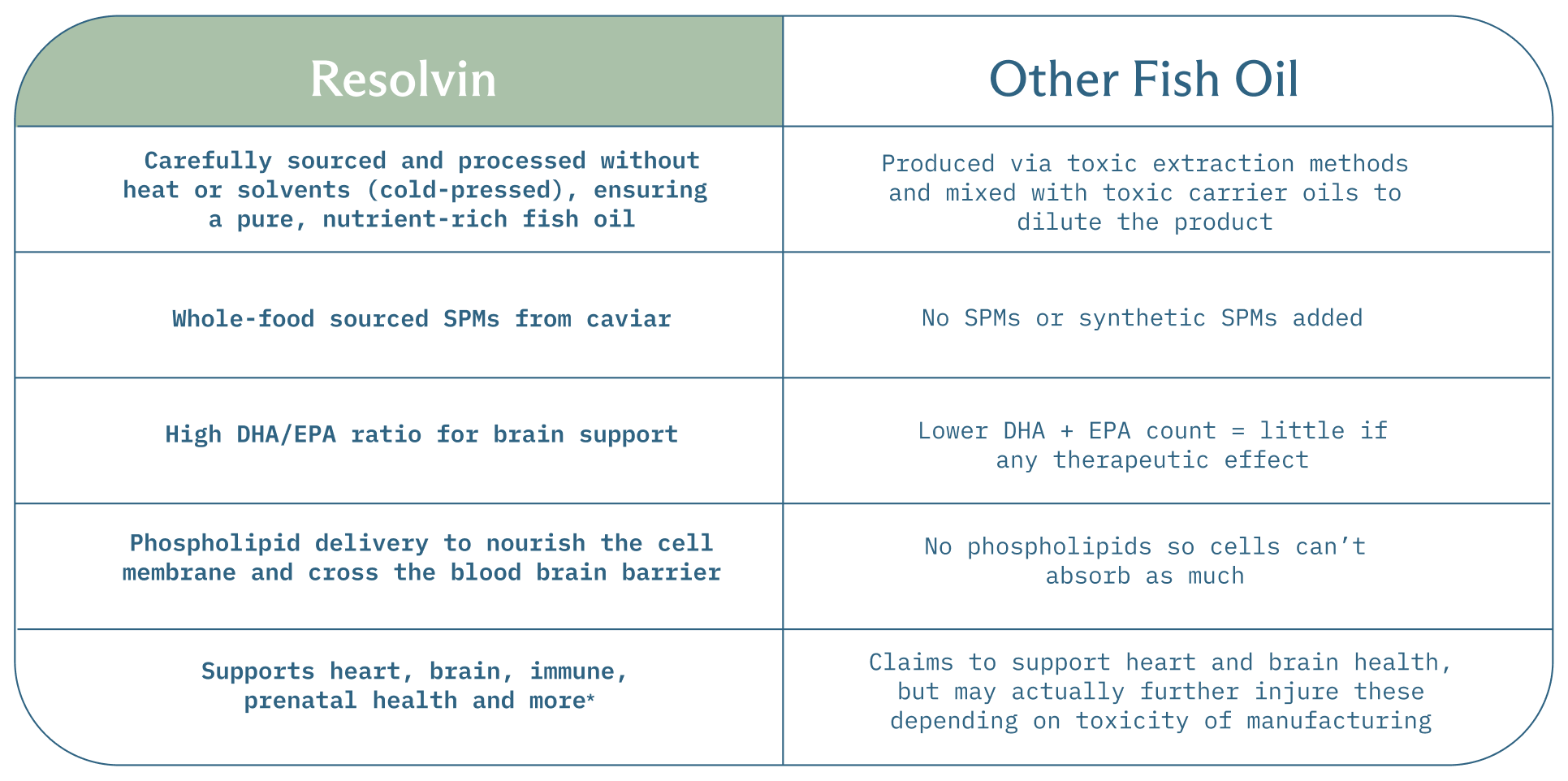Resolvin contains a ratio of 3:1 DHA/EPA omega-3 fatty acids. This higher ratio of DHA to EPA is ideal for brain and nervous system support, prenatal and postnatal care, and healthy aging.*